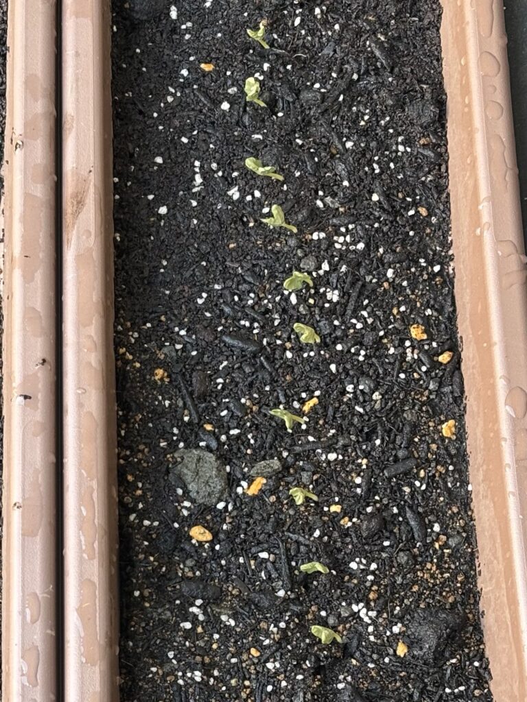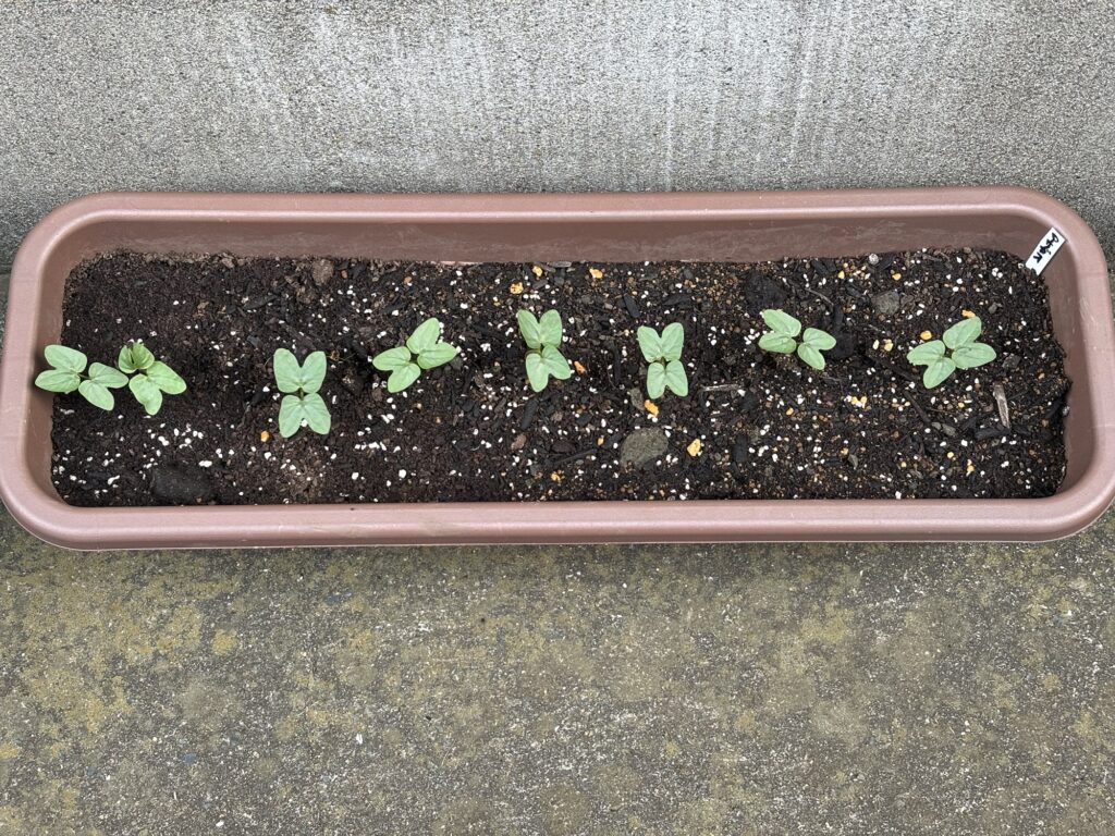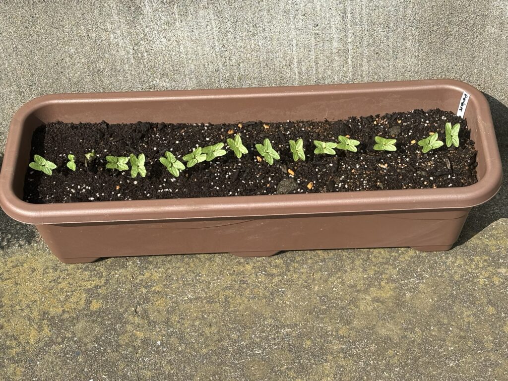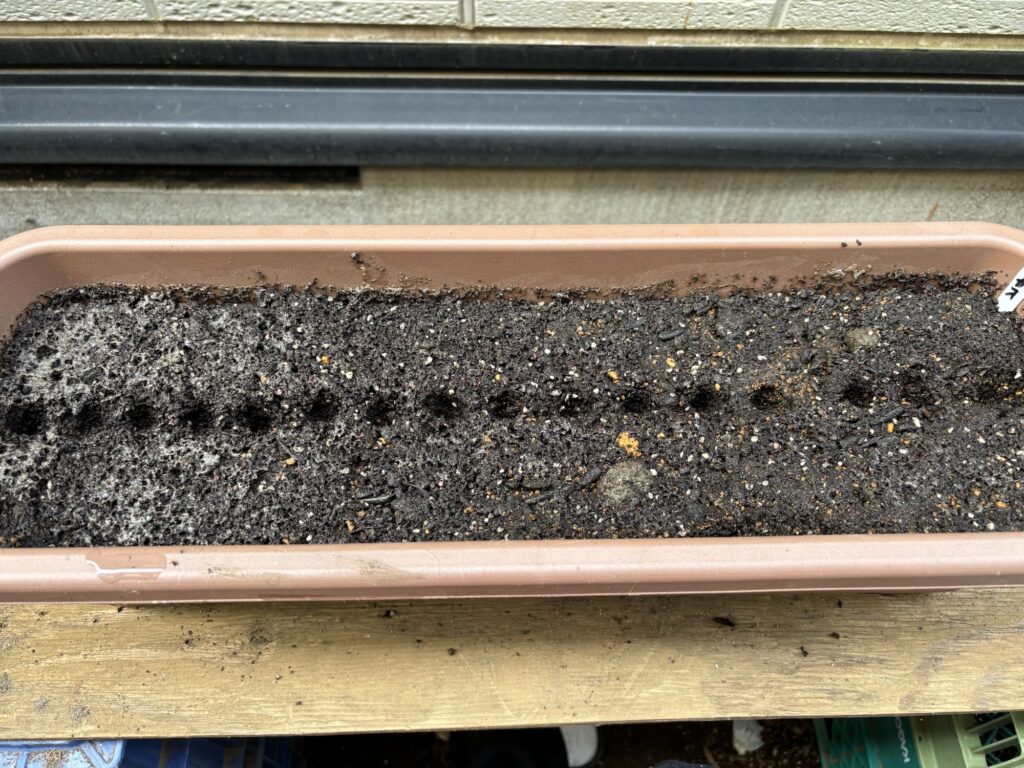 プランターに市販の培養土を入れ、水をたっぷり掛けて、1cm位の穴を開け種をまいて、土を被せました。