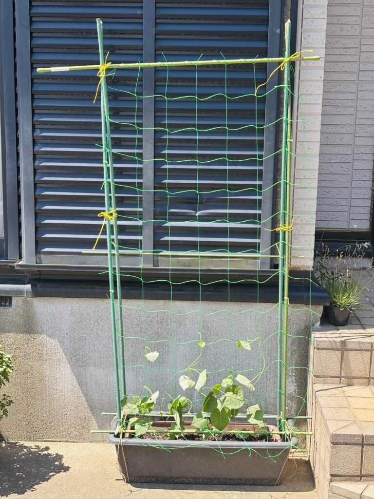 7月26日、ダイソーで園芸ネットと結束バンドを買って来て支柱を立てました。