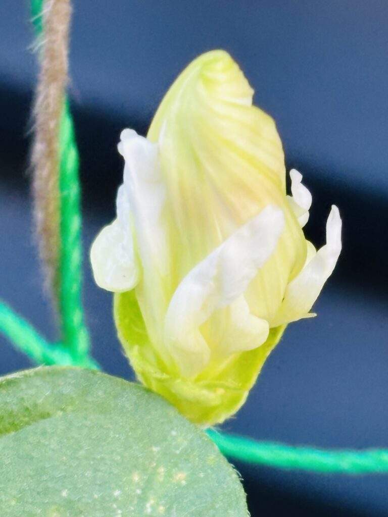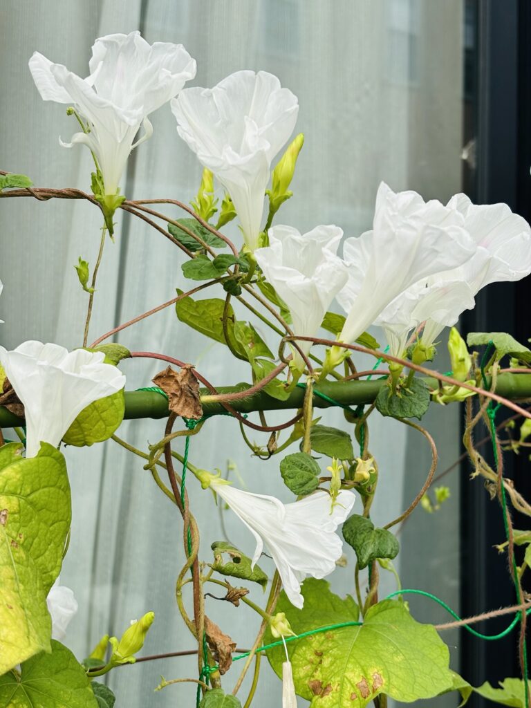 支柱にいっぱいツルが伸び葉っぱも花もたくさん咲いてくれたら、きっと見応えのある可愛い朝顔だったと思います。