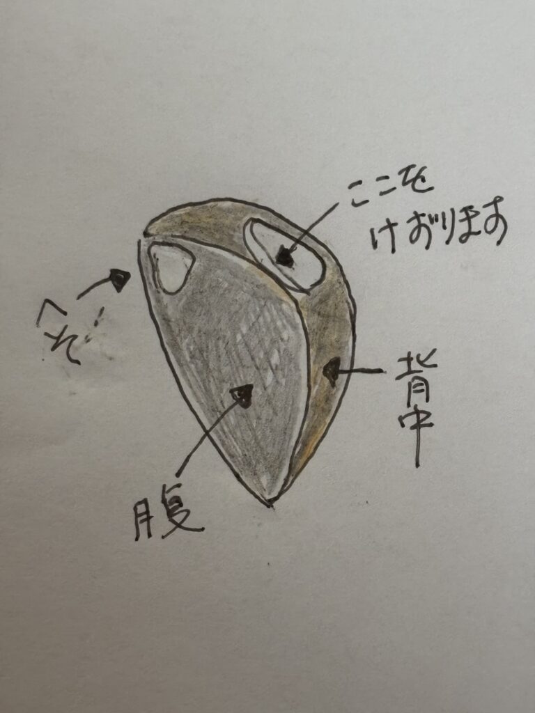 種の[へそ]の部分を傷つけないように、[へそ]以外にカッターや爪切りのやすりの部分などで傷つけていきます。